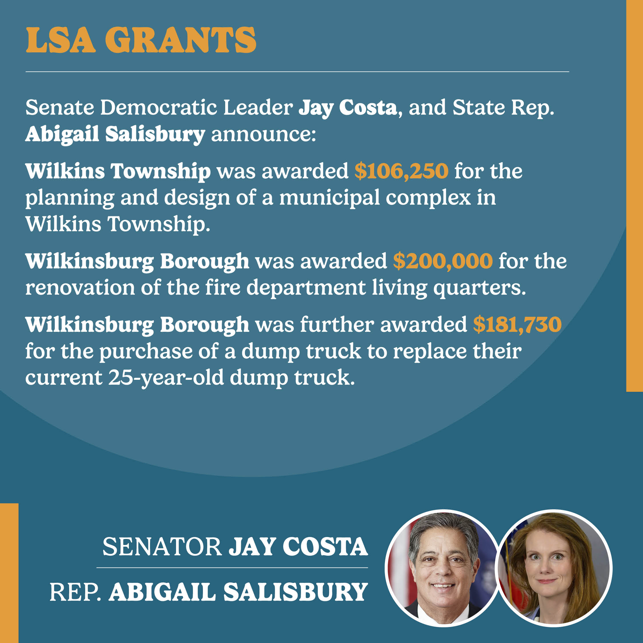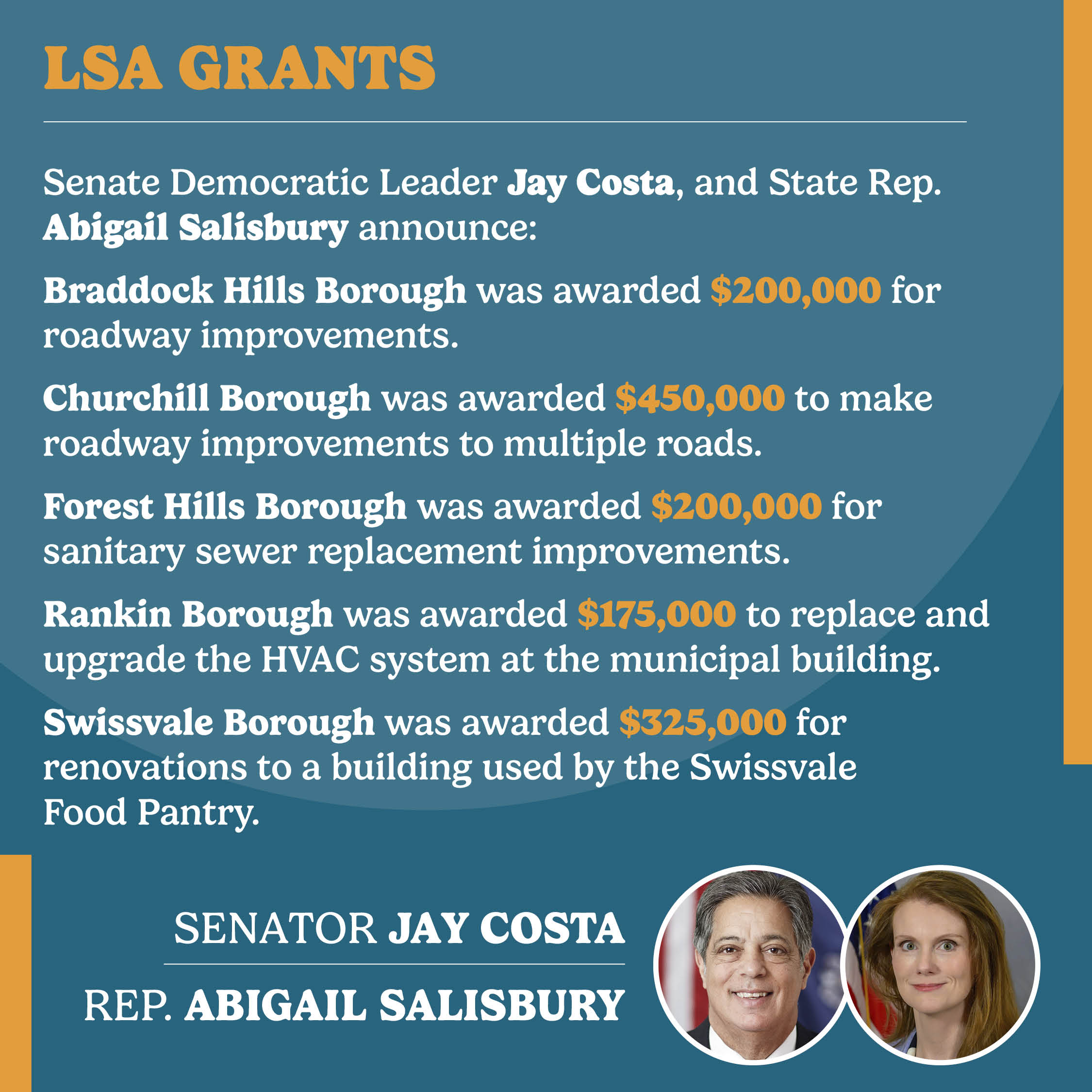 “I am delighted to be announcing the recipients of these LSA dollars to benefit our communities,” said Senator Costa. “These dollars will help deliver safety, quality of life, and basic needs to our friends and neighbors across the 43rd district. I look forward to seeing these dollars improve our municipalities and the daily experiences of our fellow residents. I was pleased to work with each of my House colleagues to advocate for and secure these important grants for all the awardees.”