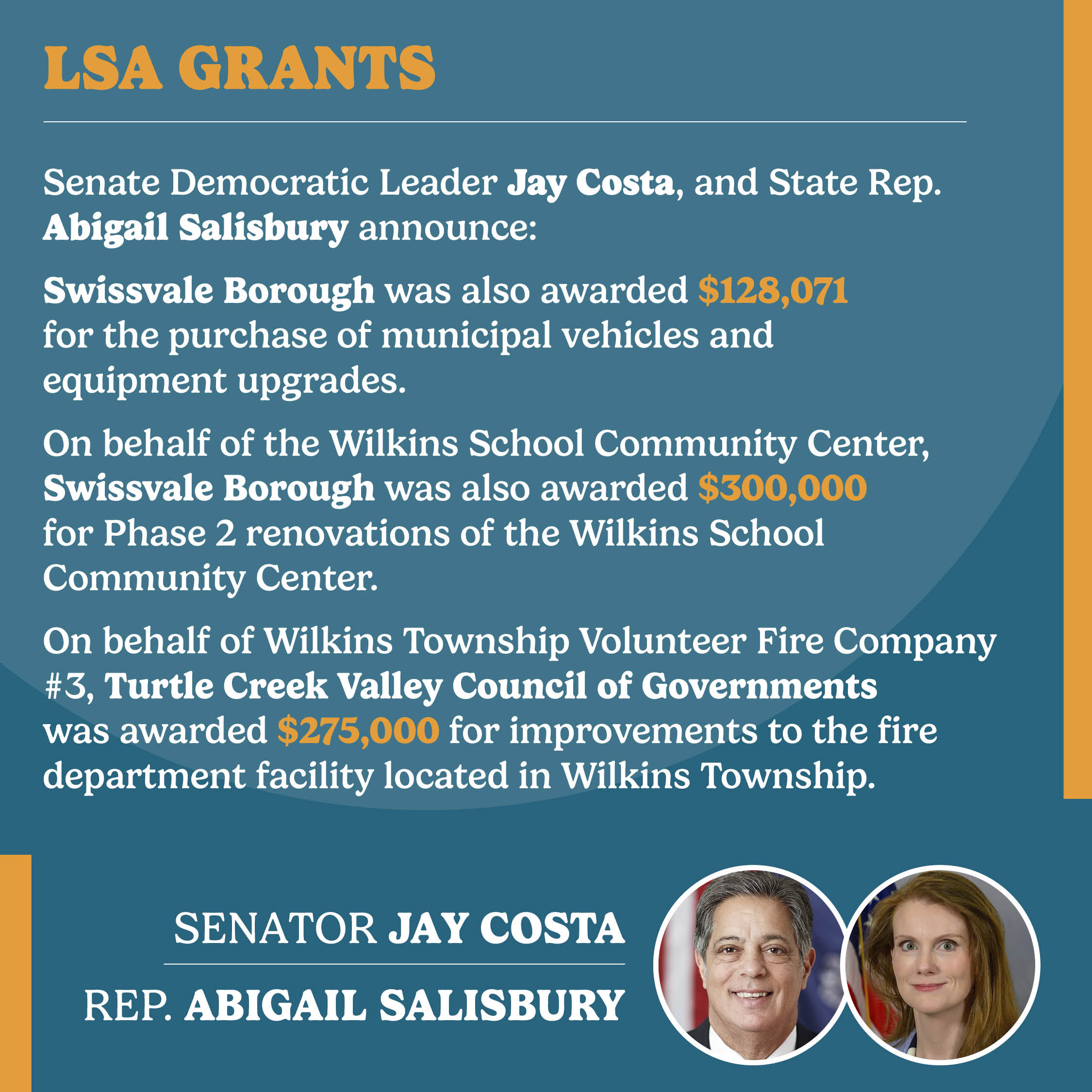 - On behalf of the Wilkins School Community Center, Swissvale Borough was also awarded $300,000 for Phase 2 renovations of the Wilkins School Community Center.