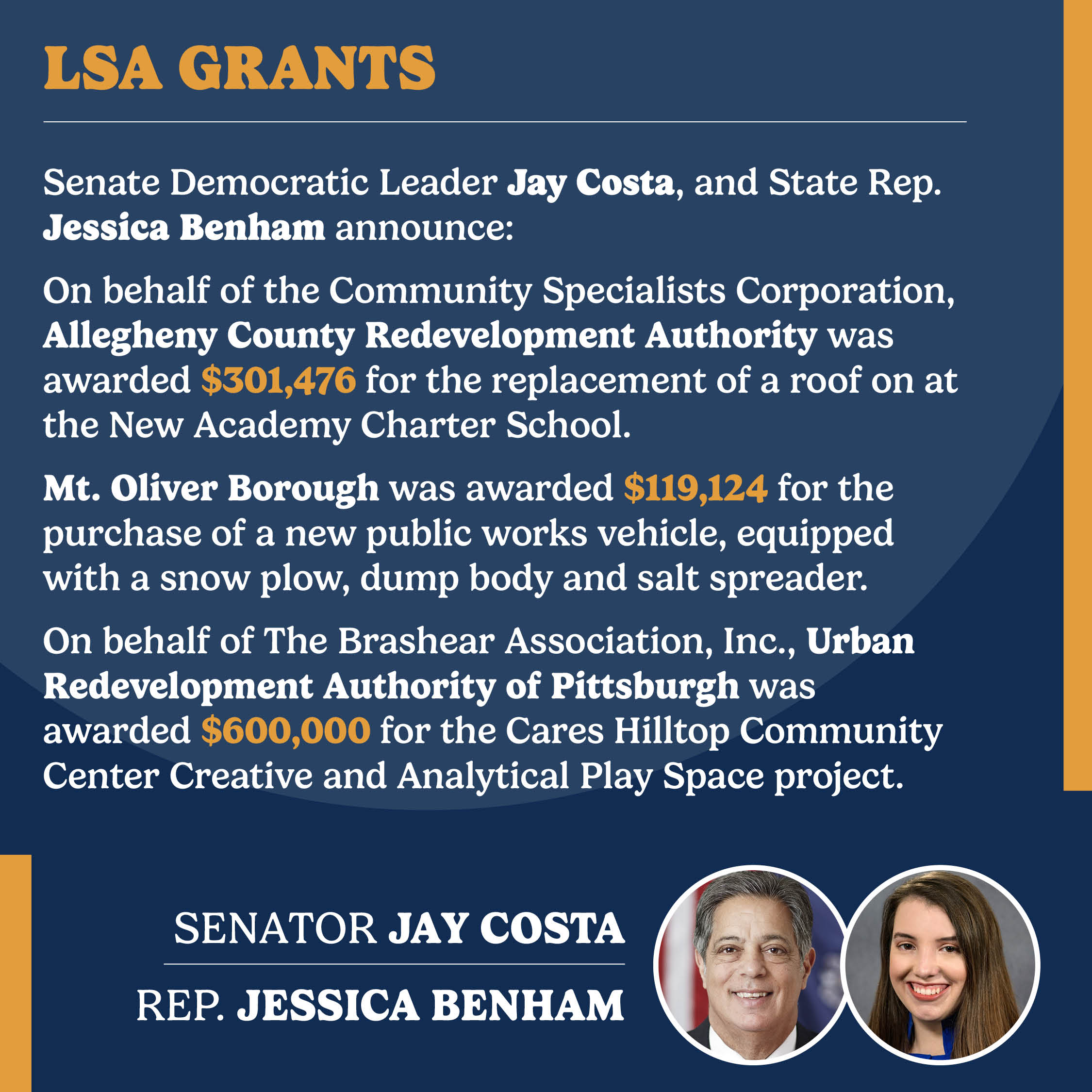 “These investments will make a real difference in neighborhoods across Pittsburgh and Allegheny County,” said state Rep. Jessica Benham, D-Allegheny. “State funding for things like safer school buildings, more reliable public works equipment, and resources for first responders goes a long way toward improving the quality of life for residents.”