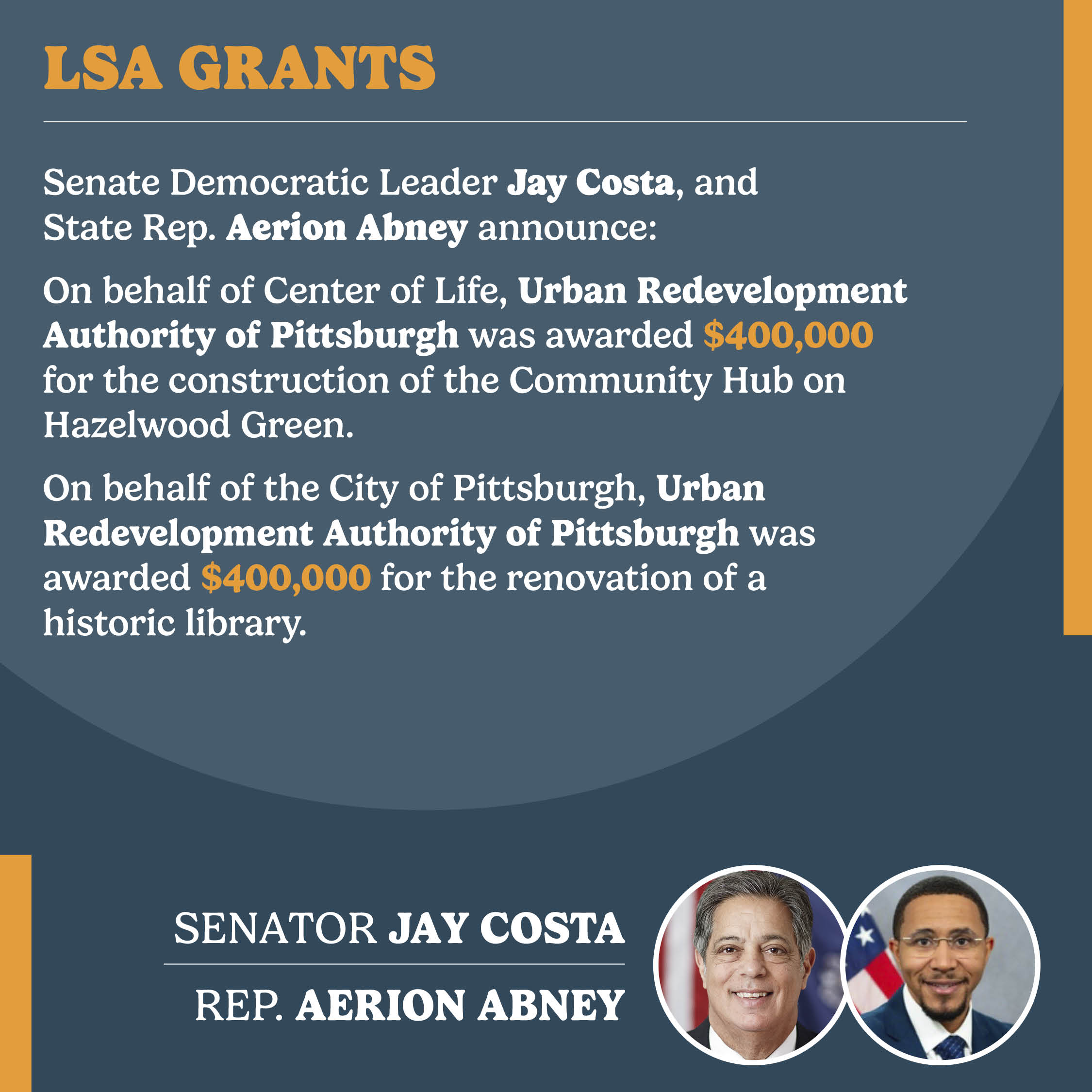 - On behalf of Center of Life, Urban Redevelopment Authority of Pittsburgh was awarded $400,000 for the construction of the Community Hub on Hazelwood Green. The facility will provide community services, educational programs, and job training.