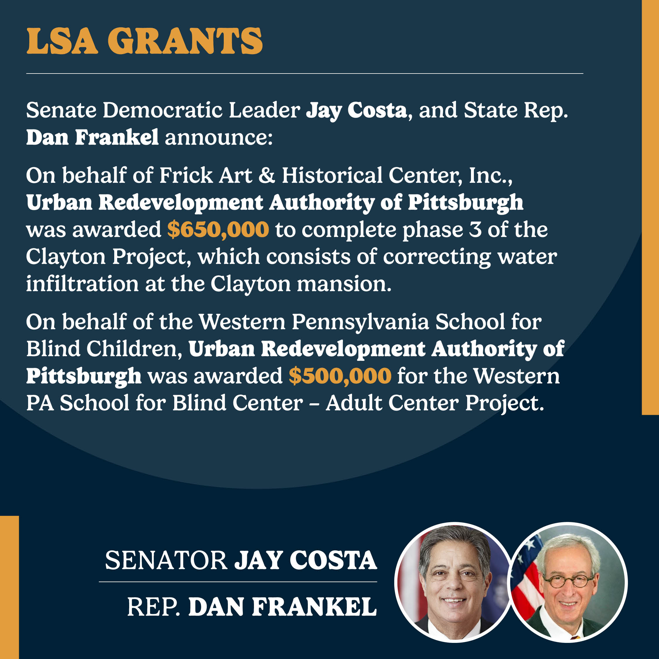 - On behalf of Frick Art & Historical Center, Inc., Urban Redevelopment Authority of Pittsburgh was awarded $650,000 to complete phase 3 of the Clayton Project, which consists of correcting water infiltration at the Clayton mansion.