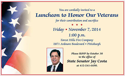 If you are a veteran or know someone who is, please call my Forest Hills office by Oct. 30 at 412-241-6690 to RSVP. I am anxious to meet and speak with all veterans and their families.
